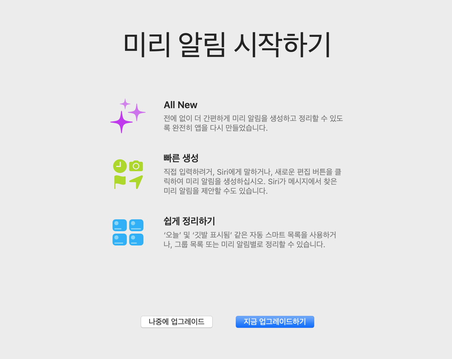 미리알림 앱을 키니까 이건 또 따로 업그레이드 하라고 나오네. 다 업그레이드해서 보니까 이제 시리로 미리알림을 설정할 수 있다.