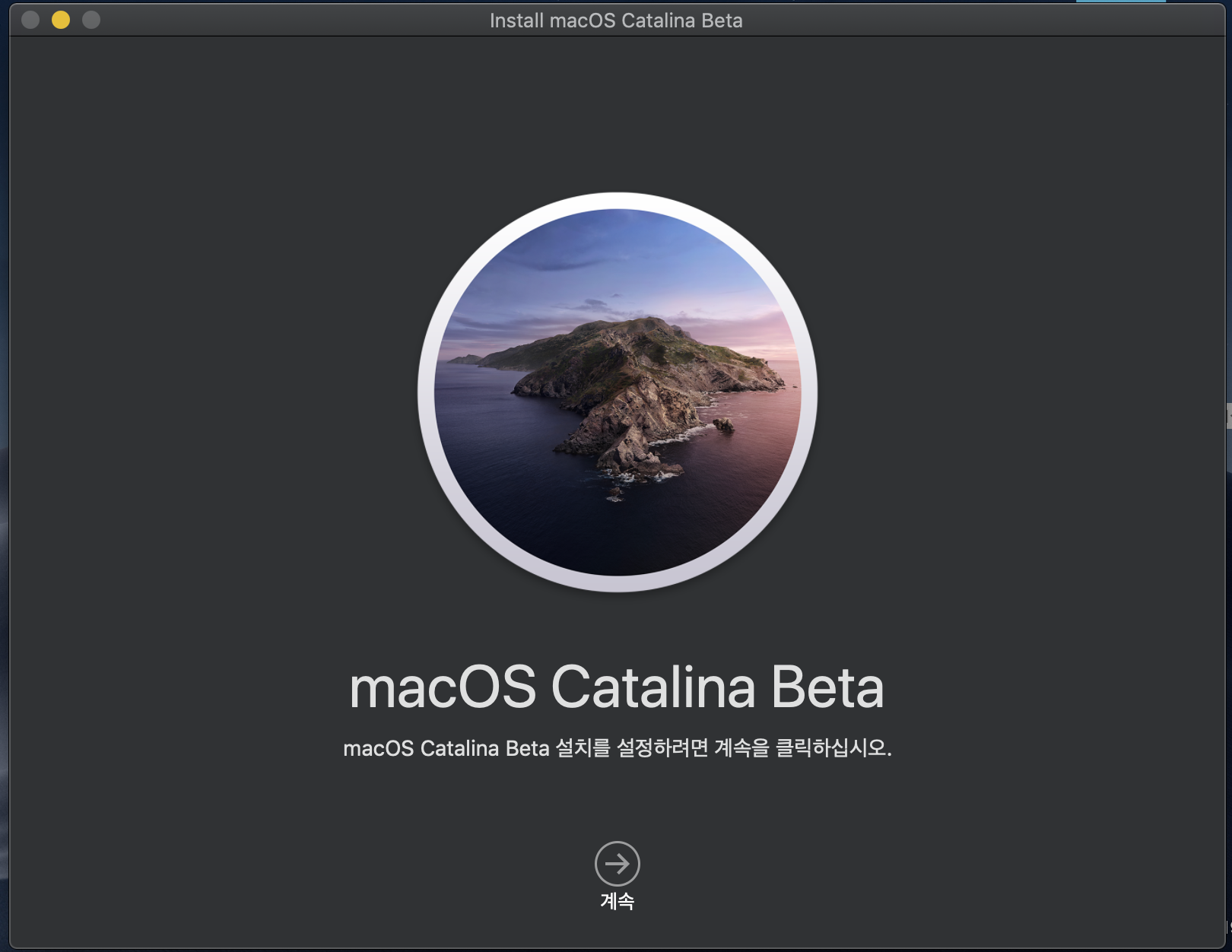 macOS Catalina Beta, 설치를 설정하려면 계속을 클릭하십시오. 그래 계속하자. 잘 해보자 우리.