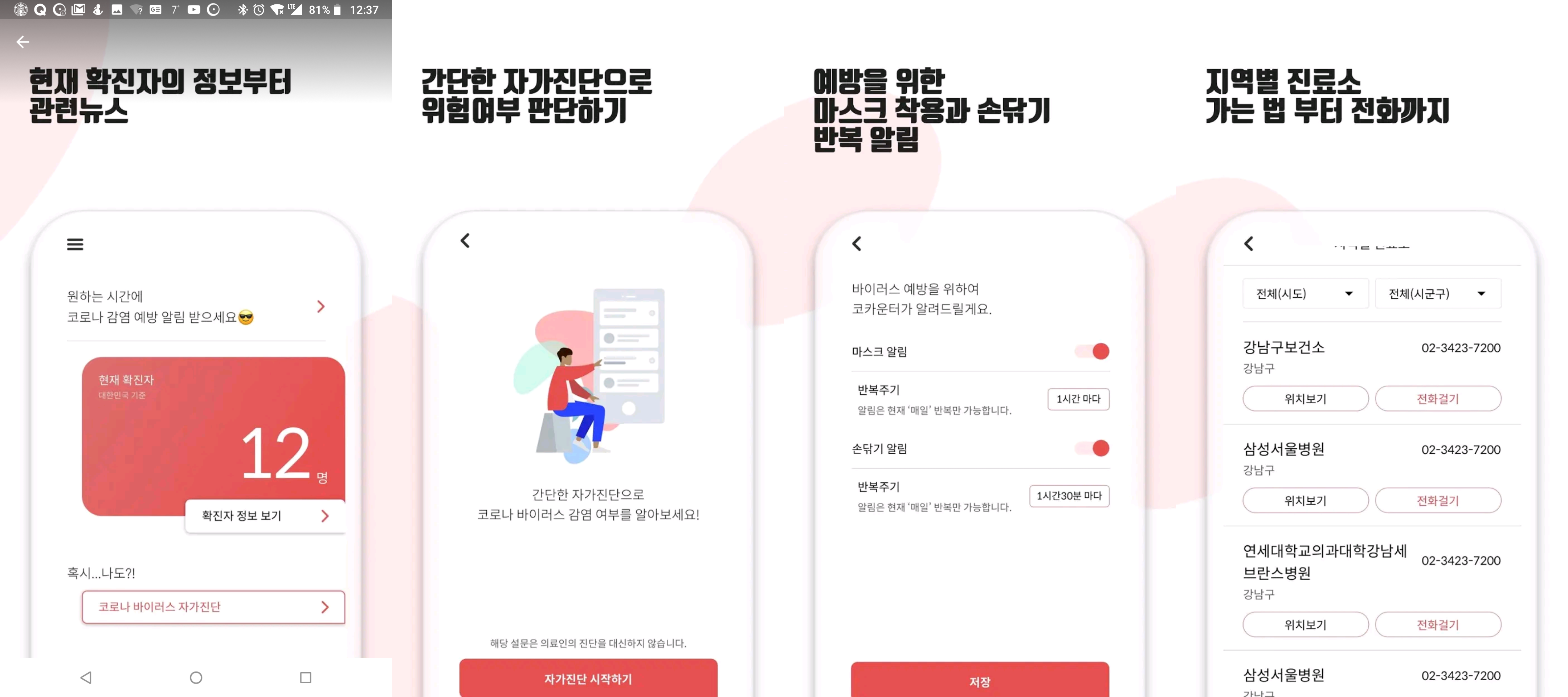 지역별 진료소, 가는 방법, 전화까지 바로 연결해줘서 사용자가 코로나 감염에 대해 자기관리를 할 수 있도록 도와준다.