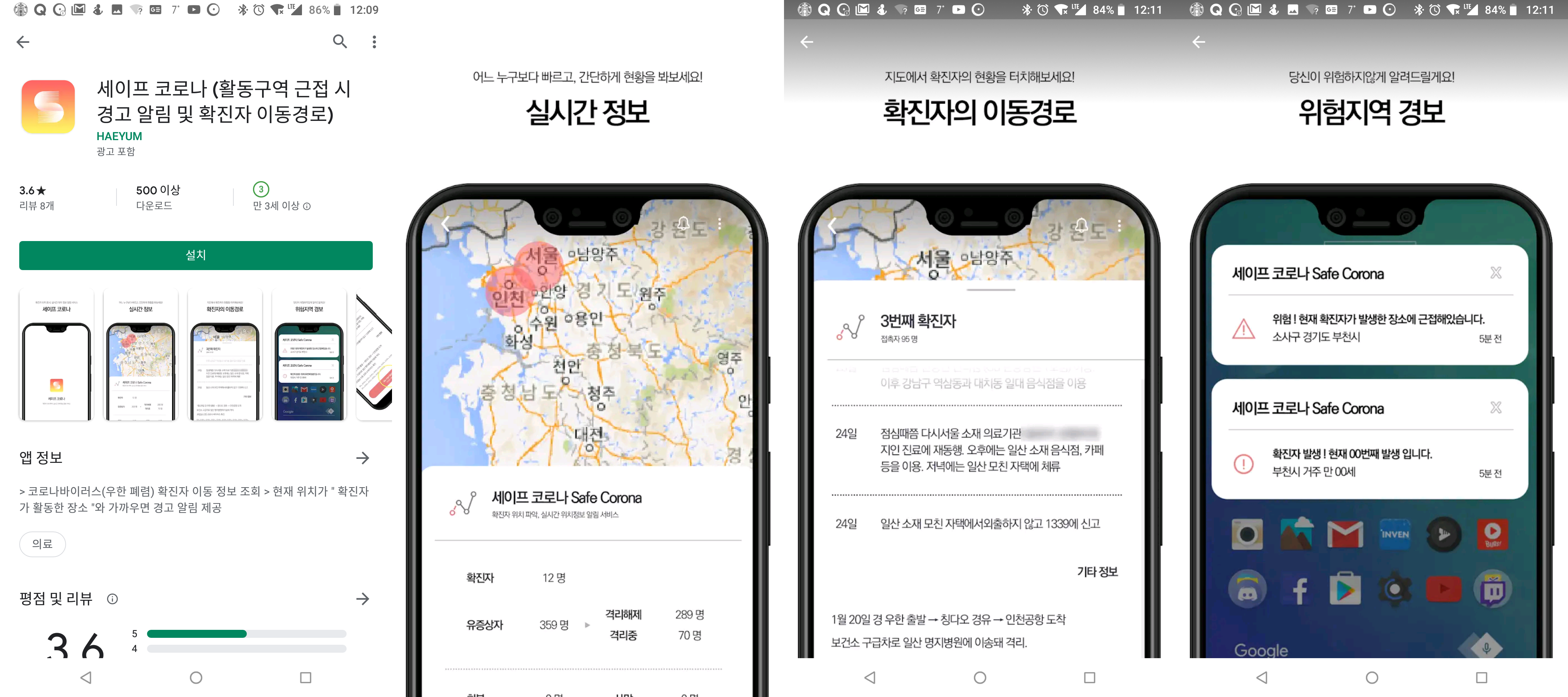 세이프 코로나 어플은 코로나 확진자가 발생했을 때 알림을 주고, 코로나 확진자 활동 장소에 사용자가 근접했을 때, 역시 경고 및 알림을 주는 어플이다. 그냥 경로를 볼 수 있는 어플보다 더 적극적으로 사용자를 일깨우는 어플